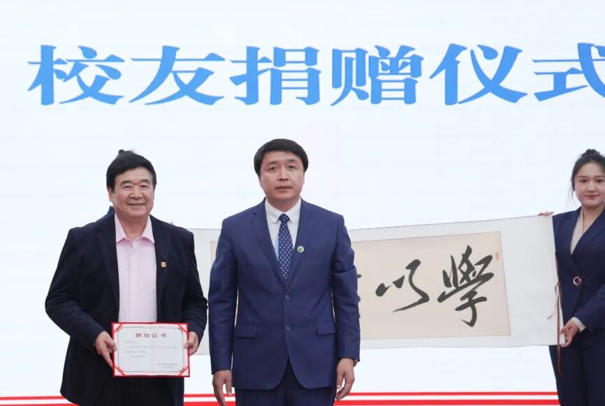 主旨发言结束后,现场举行了温馨的校友捐赠仪式。王璟向母校赠送了自己精心创作的书法作品,作品笔势苍劲有力,字里行间饱含着对母校60华诞的美好祝福。康忠伟代表学校接受捐赠,为其颁发捐赠证书,并表示衷心感谢。