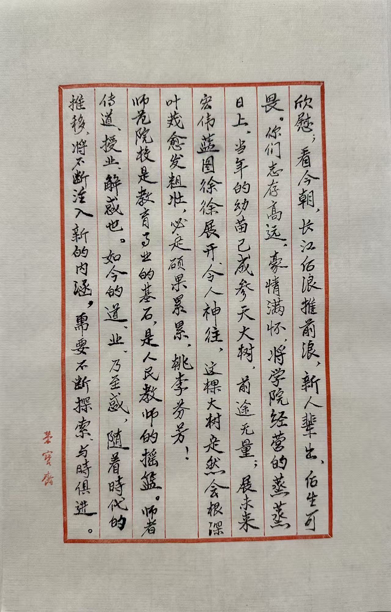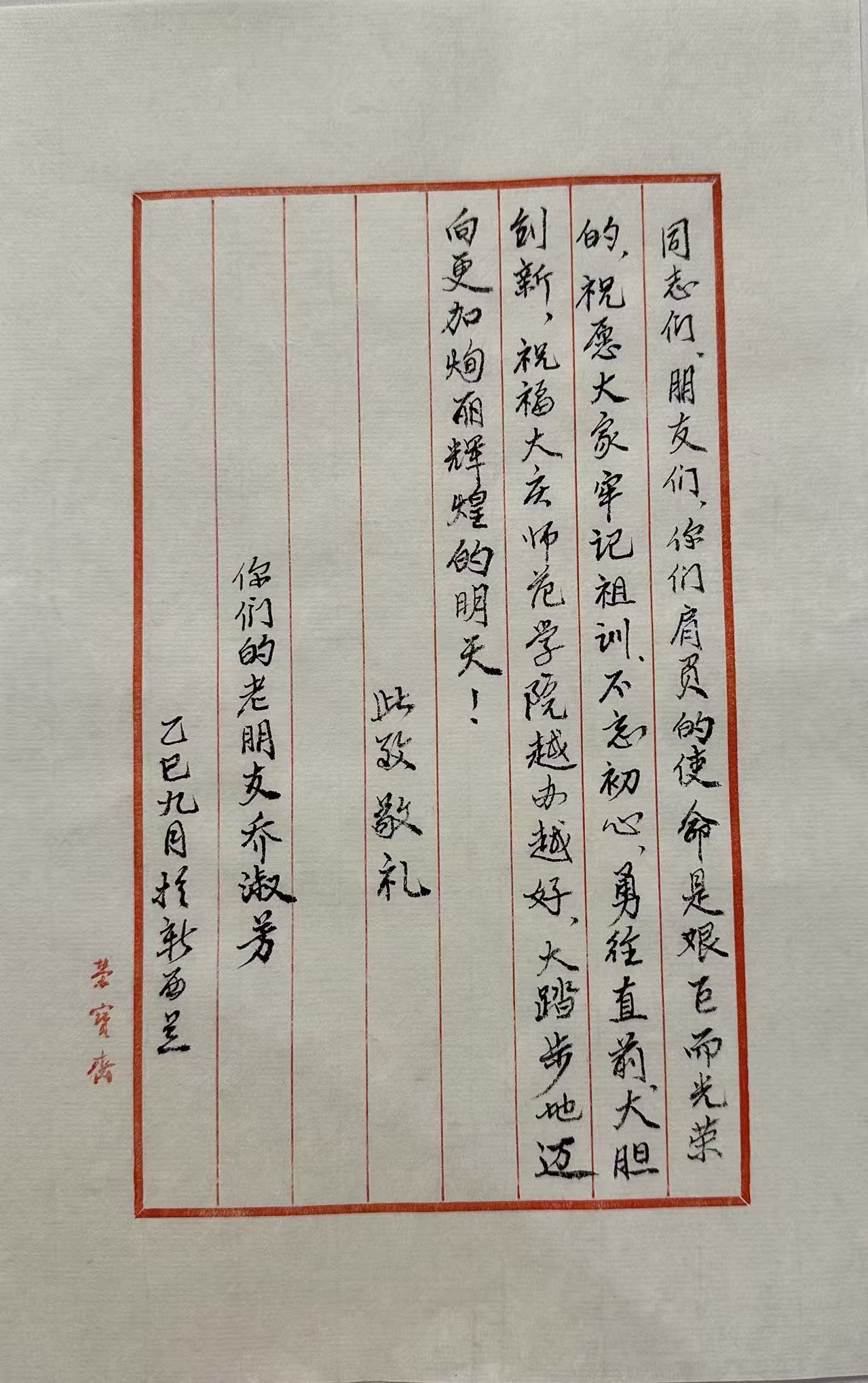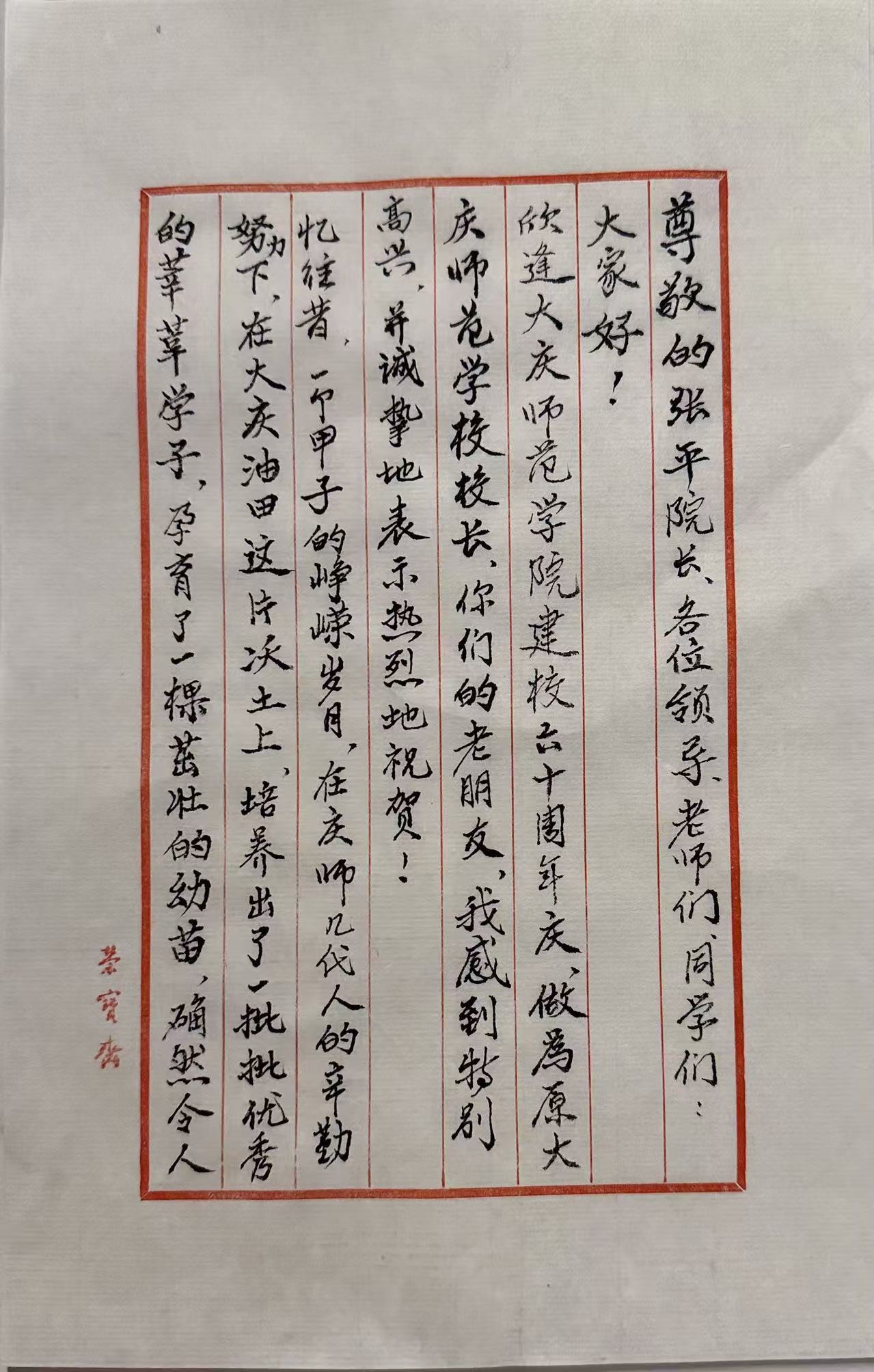 原大庆师范学校校长乔淑芳向学校六十周年校庆发来贺信