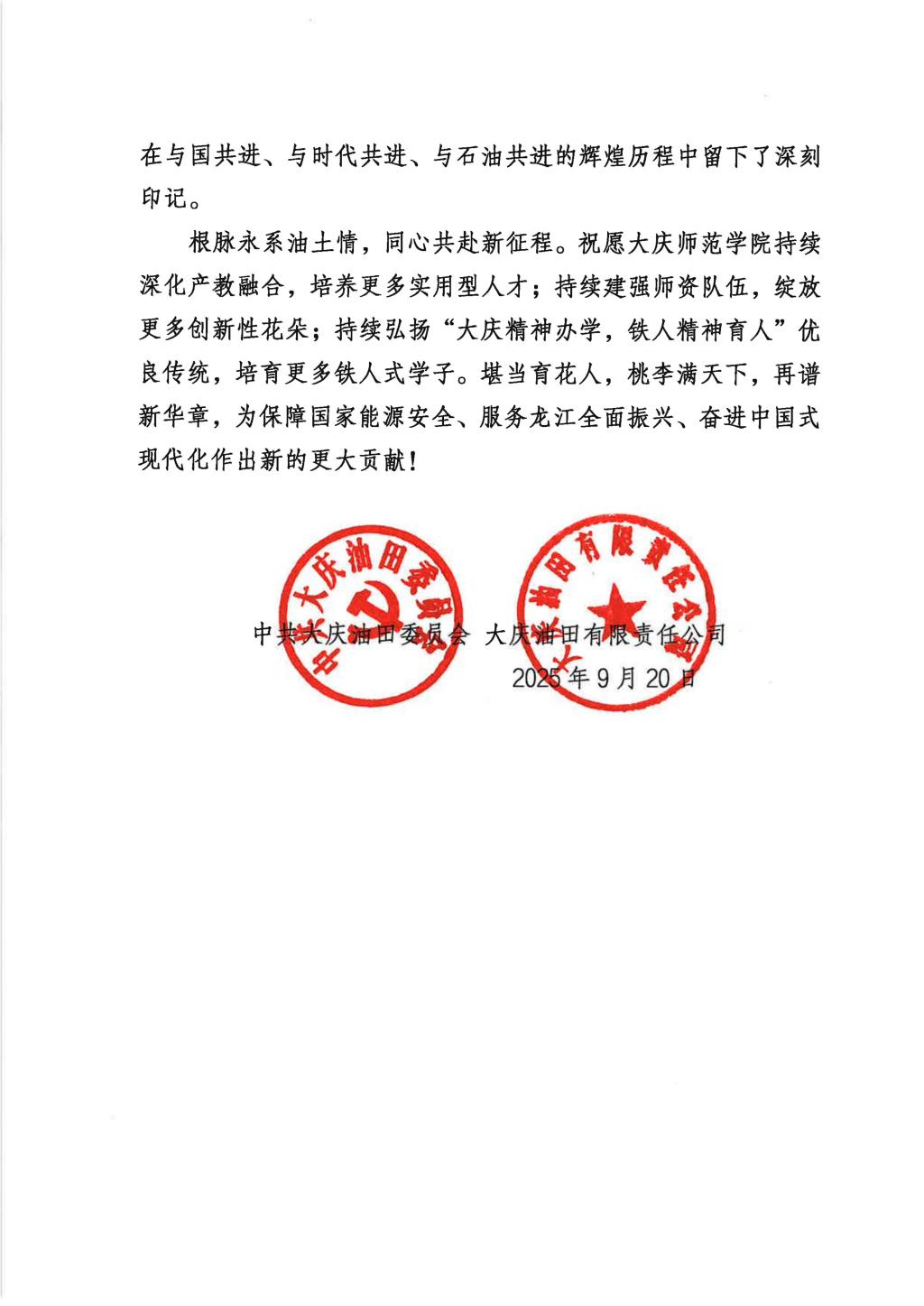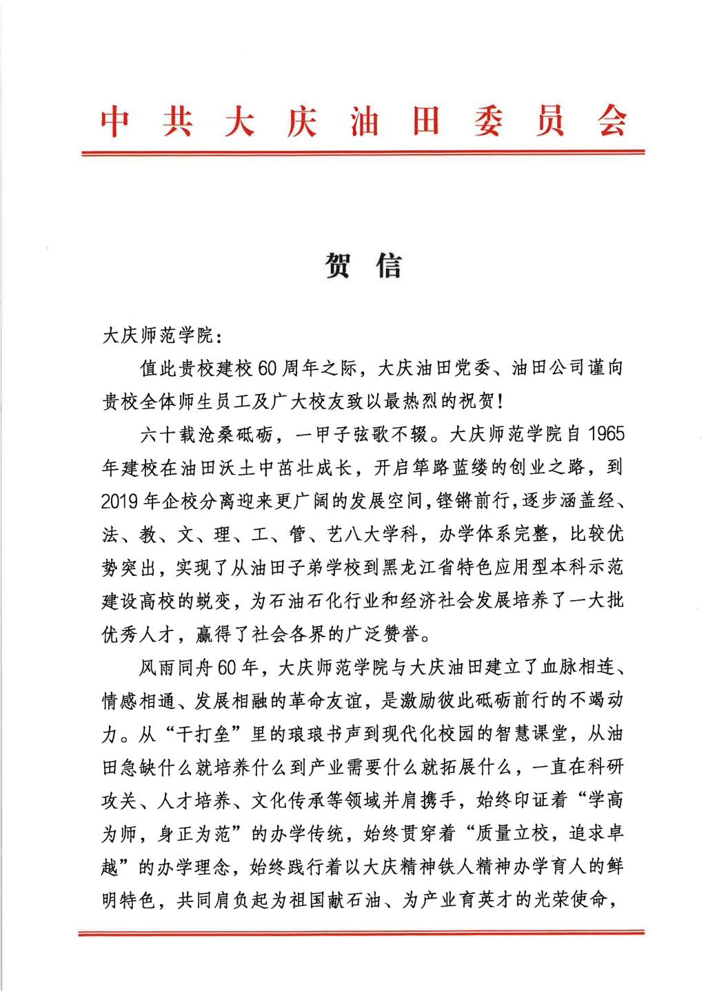 大庆油田党委向我校发来六十周年校庆贺信