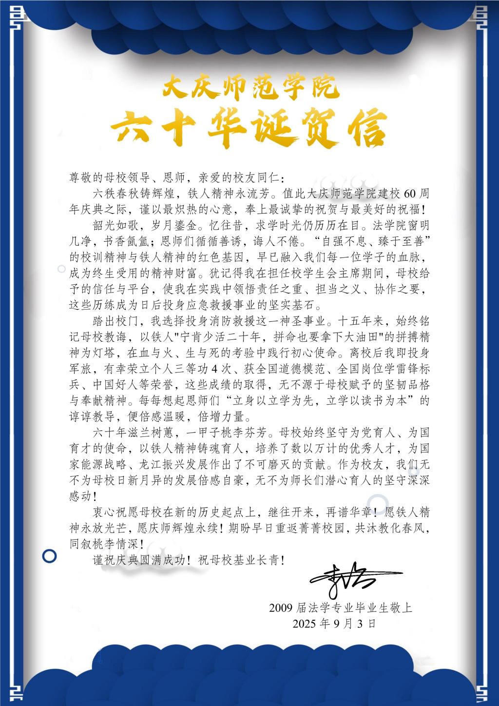 我校校友大庆市第三十六中学于开庆向母校六十周年校庆送来祝贺