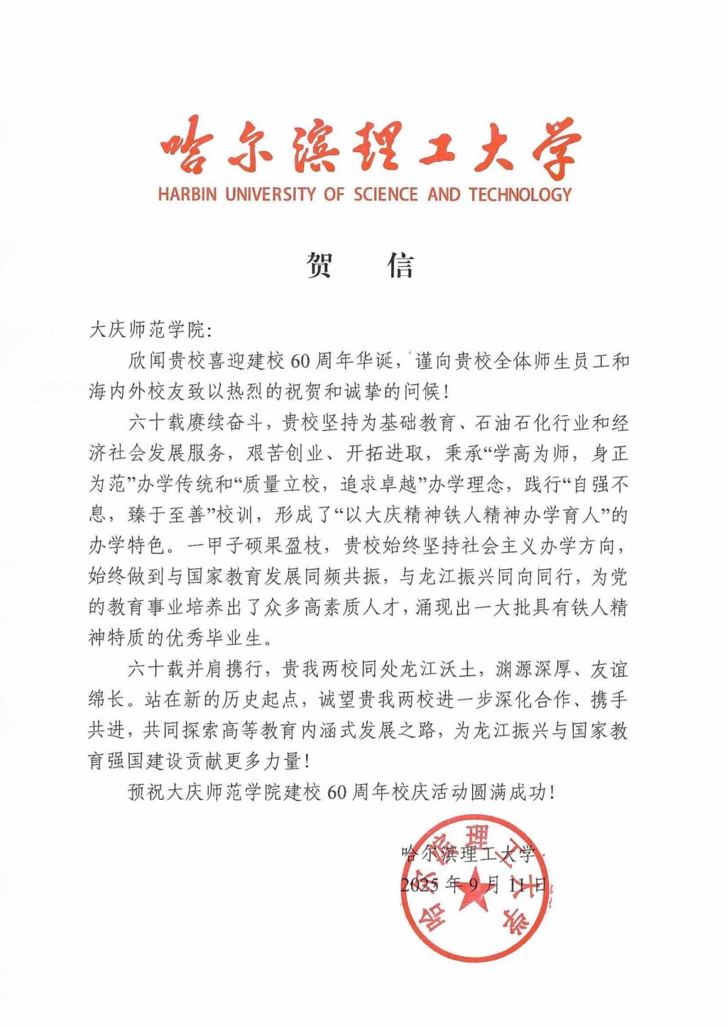 哈尔滨理工大学向我校发来六十周年校庆贺信