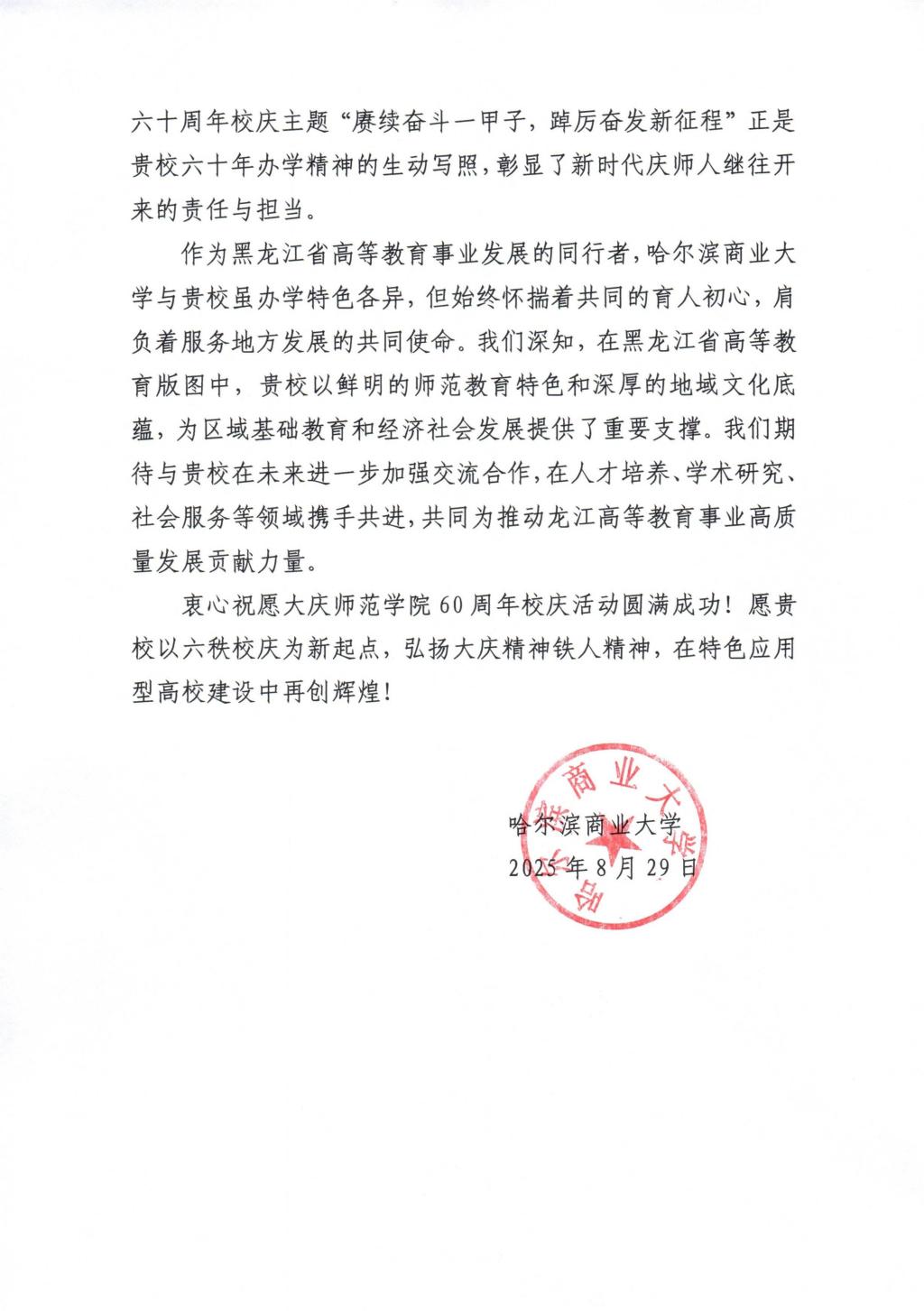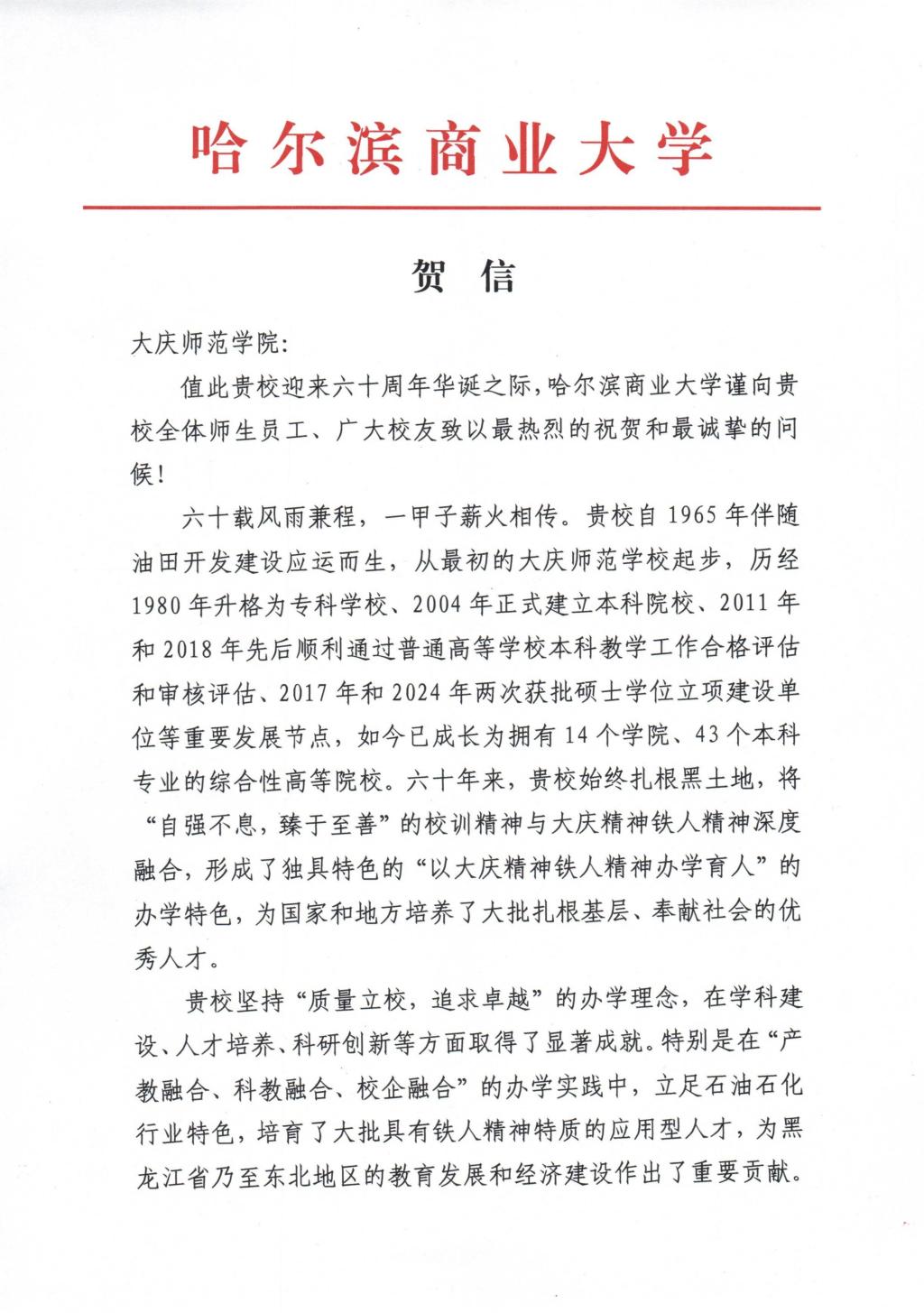 哈尔滨商业大学向我校发来六十周年校庆贺信