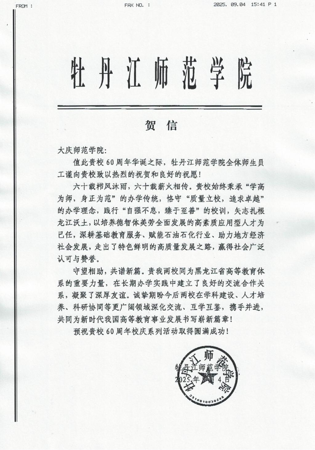 牡丹江师范学院向我校发来六十周年校庆贺信