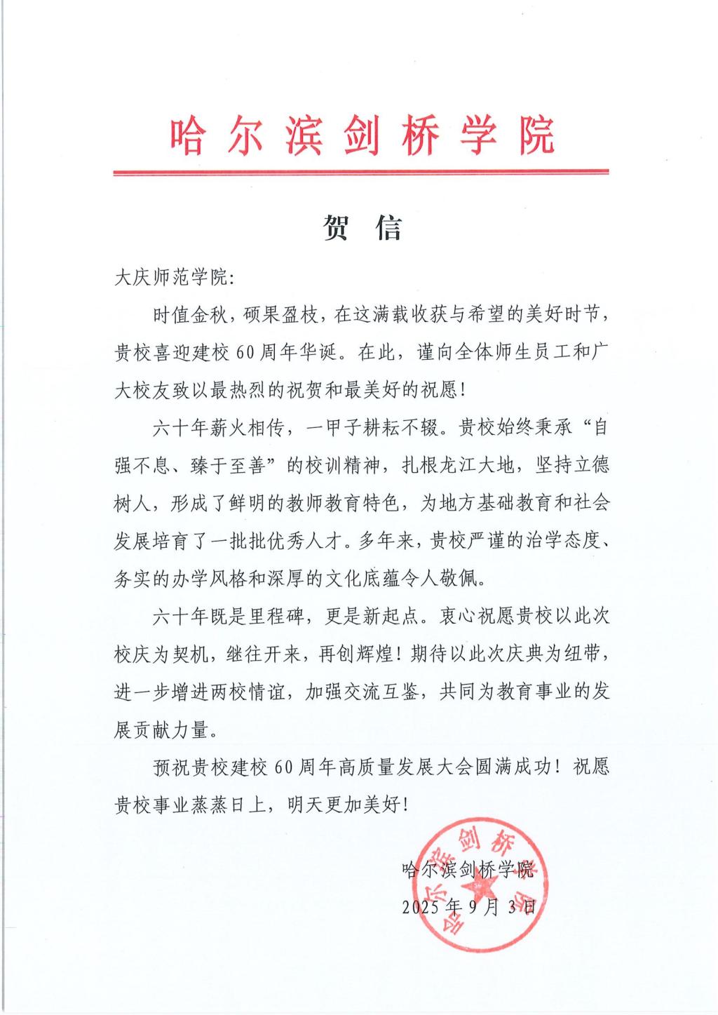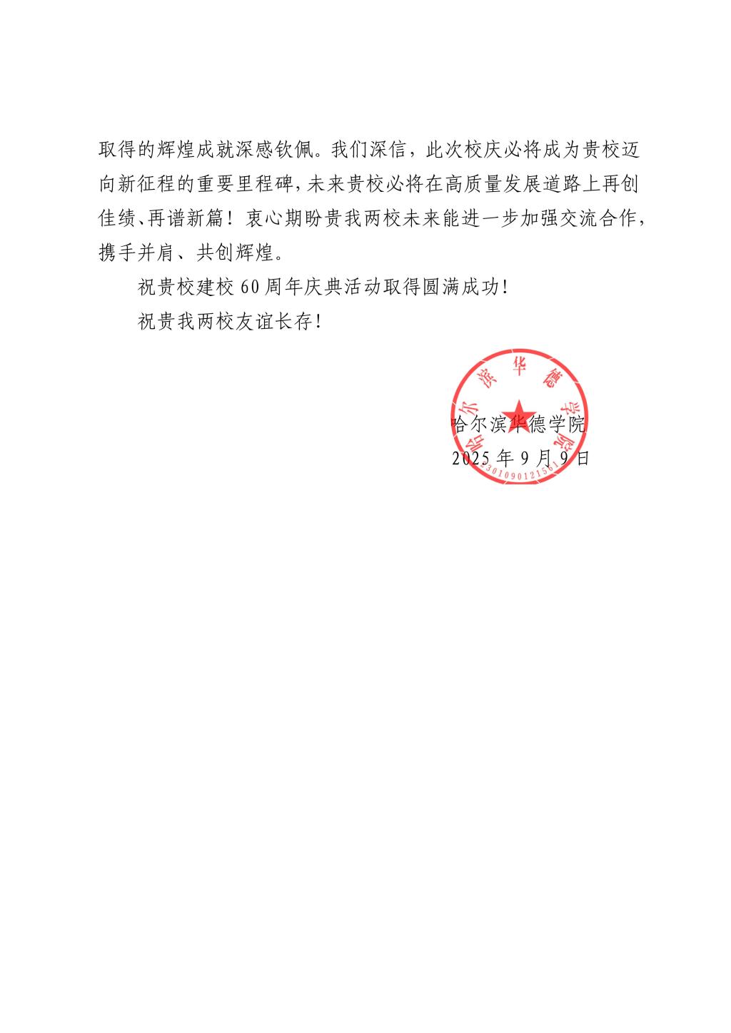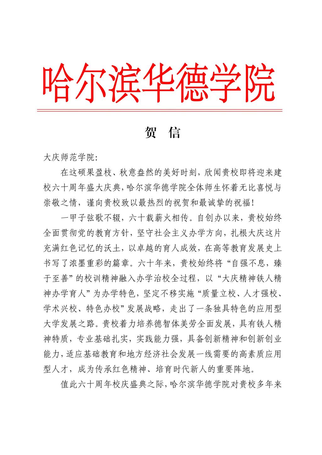哈尔滨华德学院、哈尔滨剑桥学院、哈尔滨职业技术大学、黑龙江农业职业技术学院向我校发来六十周年校庆贺信