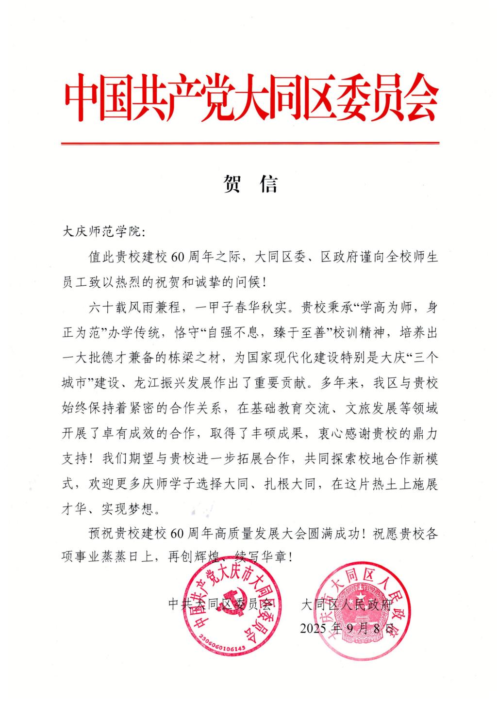 中国共产党大同区委员会向我校发来六十周年校庆贺信