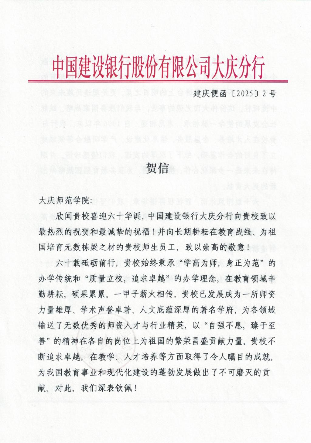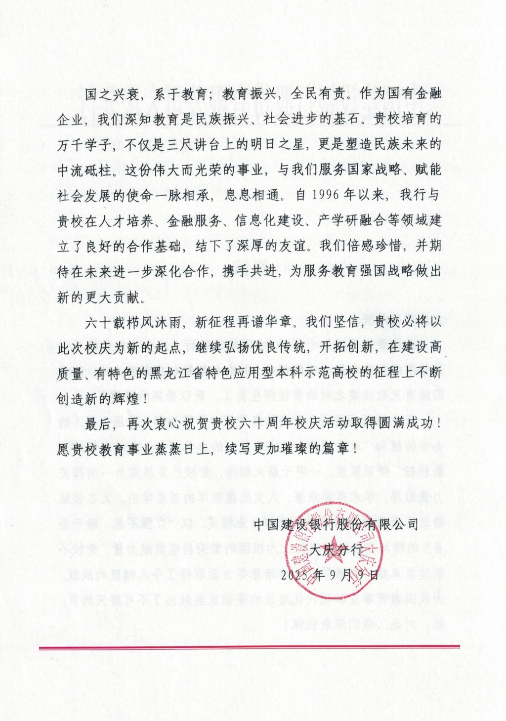 中国建设银行股份有限公司大庆分行向我校发来六十周年校庆贺信