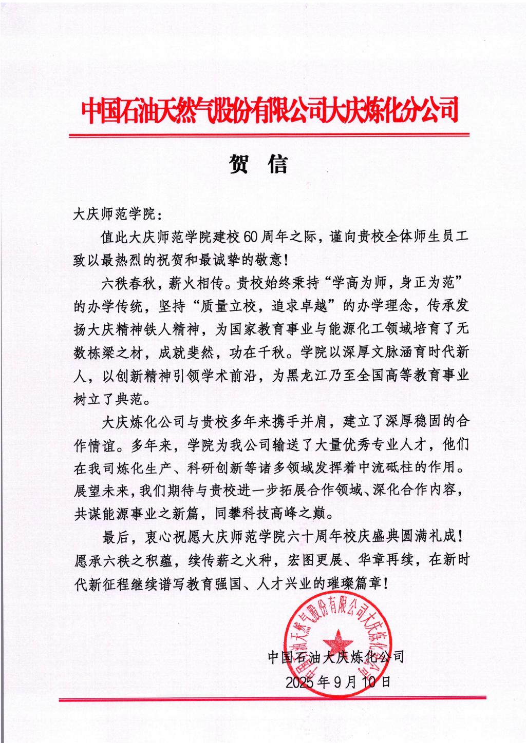 中国建设银行股份有限公司大庆分行向我校发来六十周年校庆贺信